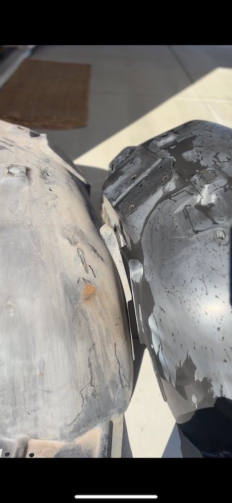 They are sitting under a covered porch after drying. Amazing difference though on these 38 year old plastic wheel well liners. 1. Side by side comparison of plastic wheel well cleaned only with KBS Klean 2. Side by side comparison of plastic wheel well cleaned with only KBS Klean 3. Wheel well just before using KBS UnderCoat in an aeresol 4. Post KBS UnderCoat and looks brand new!