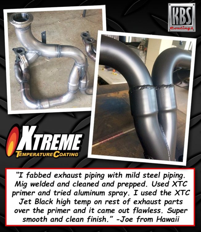 “I fabbed exhaust piping with mild steel piping. Mig welded and cleaned and prepped. Used XTC primer and tried aluminum spray. I used the XTC Jet Black high temp on rest of exhaust parts over the primer and it came out flawless. Super smooth and clean finish.” -Joe from Hawaii High Temperature Paints from KBS Coatings